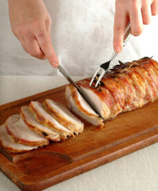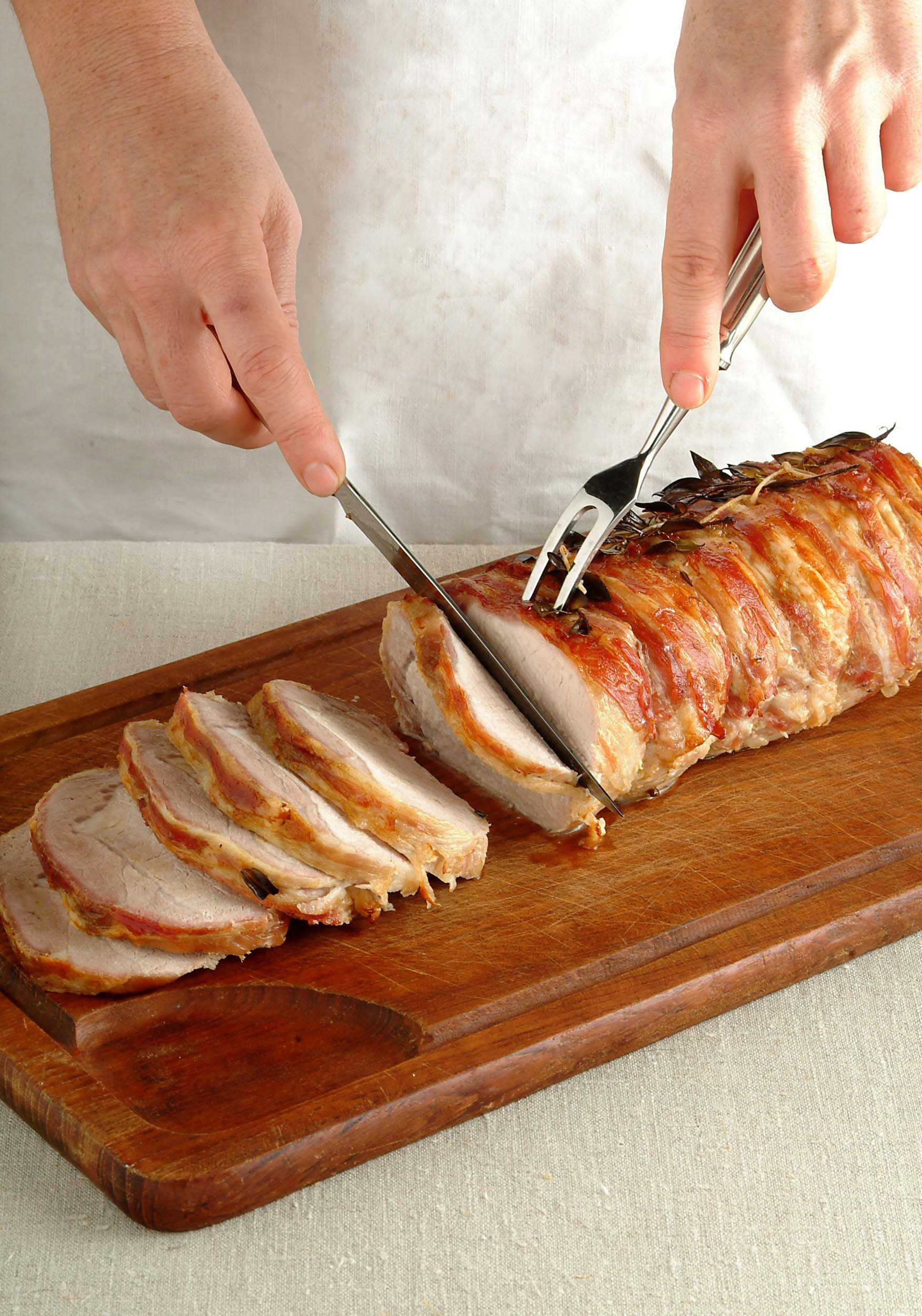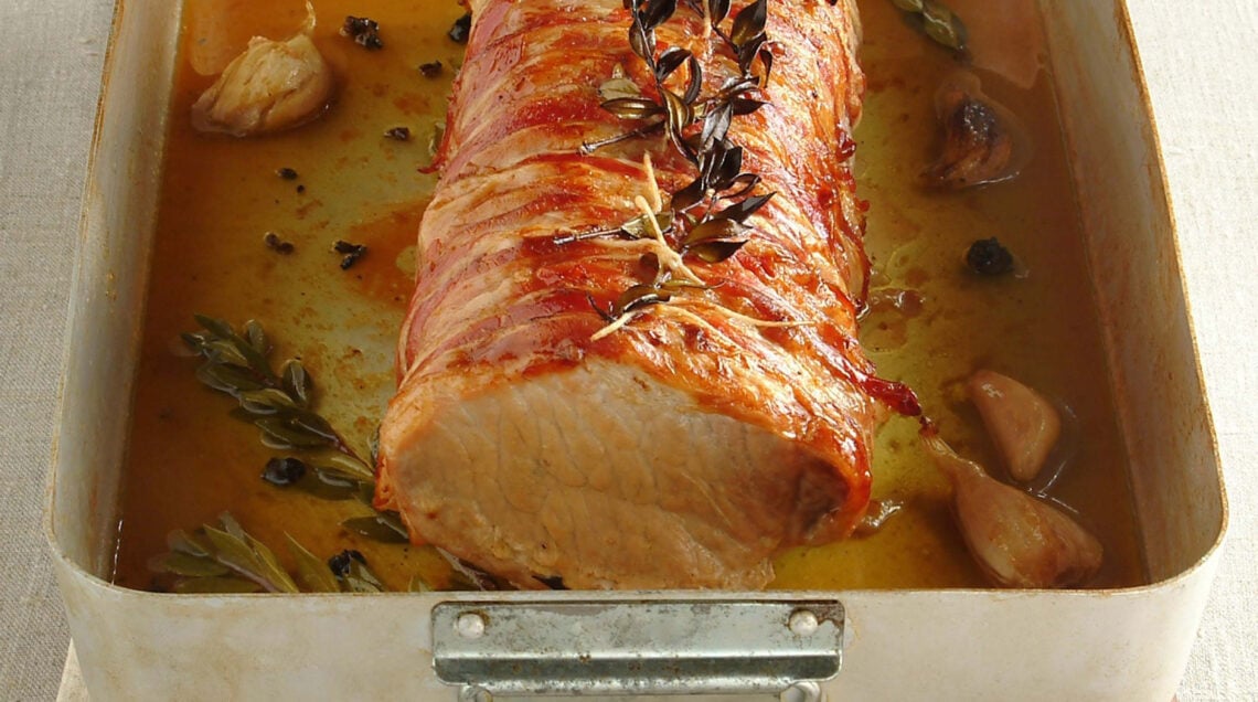 Un taglio nobile del suino, la lonza, con polpa magra avvolta dalla giusta quantità di grasso, La bardatura con la pancetta concorre alla morbidezza della polpa che a fine cottura risulta tenera e saporita, impregnata dai sapori dell'aglio, del ginepro e del mirto. Un arrosto buono anche freddo, il giorno dopo.