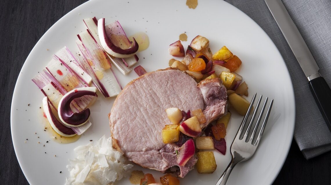 6) Disponete sui piatti caldi il contorno di frutta e verdura, le cotolette scolate, il radicchio condito e il rafano grattugiato.