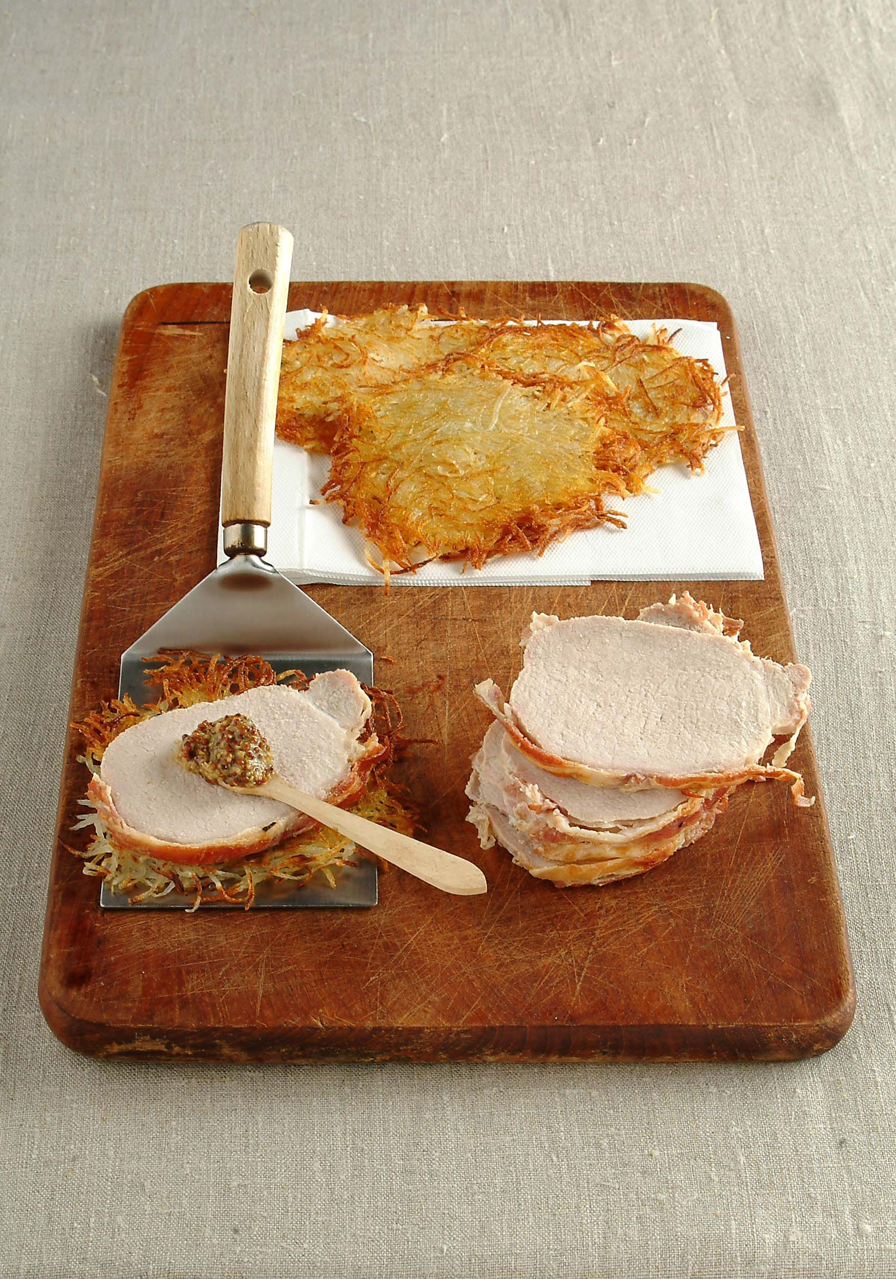 Una ricetta di riciclo per utilizzare l'arrosto avanzato dal giorno prima e il suo fondo di cottura. L'abbinamento con le patate trasformate in rosti croccanti regala un secondo sfizioso ed economico. Facile e veloce, questo piatto si prepara anche con fettine di manzo, pollo, tacchino, vitello. In versione vegetariana la carne può essere sostituita da fette di formaggio, tipo scamorza o fontina. In versione vegana, potete alternare i rosti con fettine di seitan.