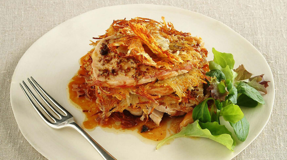 Un secondo piatto di patate e carne di maiale declinati insieme e profumati alla senape