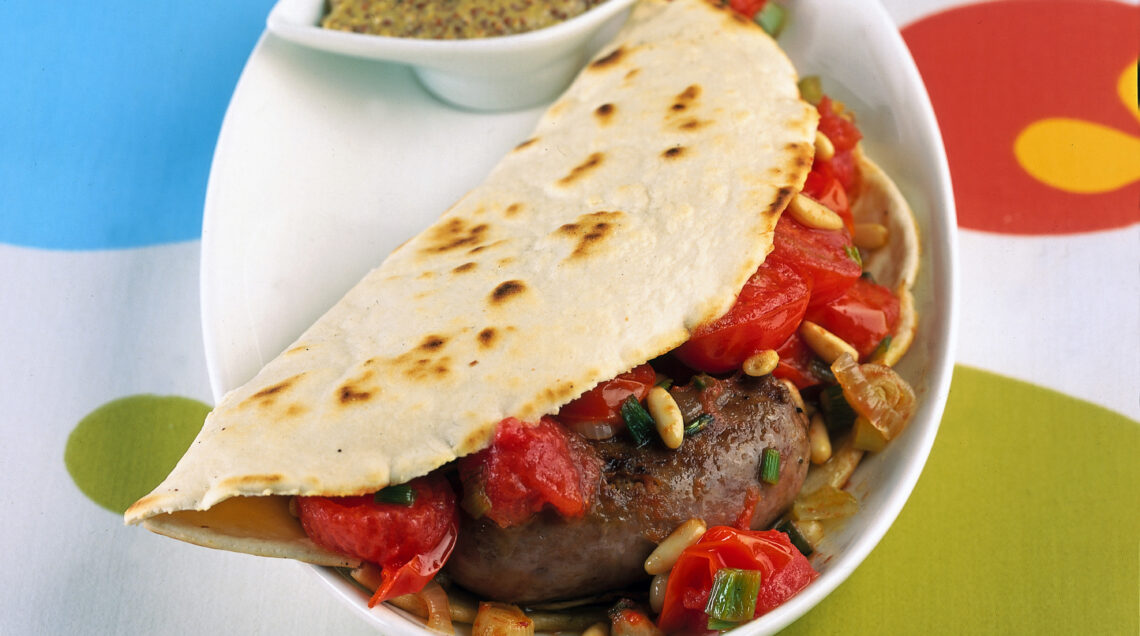 2) Taglia i pomodorini a metà, salali e lasciali insaporire per 10 minuti. Intanto su di una griglia cuoci la salsiccia, poi dividila equamente tra le 4 piadine, aggiungi il condimento, i pomodorini e servi le piadine con salsiccia e pomodorini ben calde.