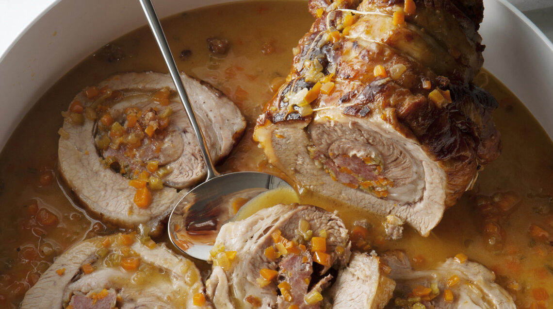 Quasi una rollatina, ripiena di salsiccia e verdure, sfumata con vino bianco e profumata al rosmarino. Fette succulente da irrorare con il sughetto di cottura