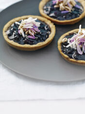 1  Disponete le fette su un tagliere e massaggiatele su entrambi i lati con una presa di sale e una macinata di pepe. Trasferite su un foglio di carta da forno le fette di lardo a due a due e disponetele a croce.