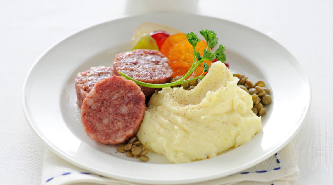 Servito intero e contornato da un morbido purè di patate e lenticchie al prosciutto, lo zampone trionfa sulla tavola di Capodanno