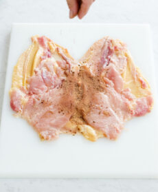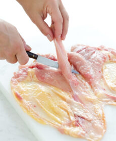Aprite su un tagliere il pollo disossato, staccate le ali e asportate con un coltellino la polpa delle cosce, i due filettini del petto e altre piccole porzioni di polpa, in modo da mantenere attaccato alla pelle uno strato di carne il più possibile uniforme.