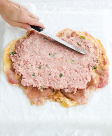 Trascorso il tempo di riposo, riaprite il pollo sul piano di lavoro, appoggiandolo su una tela bianca abbastanza larga per poter avvolgere la galantina. Mettete al centro metà del ripieno e stendetelo con una spatola, formando uno strato omogeneo.