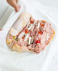 Poiché il procedimento di questo piatto richiede un po' di tempo, potete richiedere al vostro macellaio alcune operazioni, come disossare il pollo, conservare gli ossi per il vostro brodo, battere la carne del pollo che farà da involucro e tagliate il petto, che sarà parte del ripieno, a cubetti. Per gustarla al meglio, è consigliabile prepararla 1-2 giorni prima.