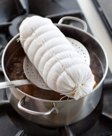 Immergete la galantina nel brodo in ebollizione, appena riprende il bollore abbassate la fiamma e continuate la cottura a fuoco lento per circa un'ora e mezza. Lasciatela riposare per qualche minuto nel brodo, poi scolatela su un vassoio. Servite la galantina fredda a fette, accompagnandola, a piacere, con cubetti di gelatina.