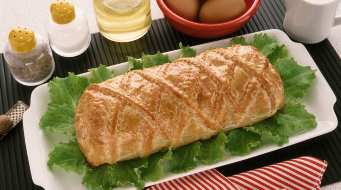 3 Formate con l'impasto un polpettone, avvolgetelo con la sfoglia e chiudete bene da ogni lato premendo con le dita. Adagiatelo in una teglia imburrata; mettete in forno caldo a 200° e fate cuocere per oltre mezz'ora. La crosta del polpettone dovrà risultare dorata. A cottura ultimata trasferite il polpettone su un piatto da portata e servitelo caldo.