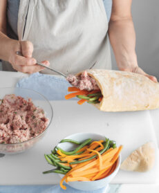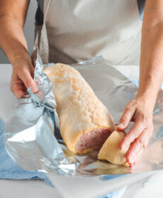 Una preparazione d'effetto per una tavola insolita o un pic nic. Con manzo, maiale, mortadella e verdure, l'involucro è fatto con pane d'Altamura
