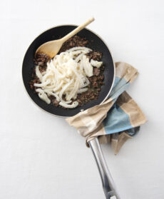 Aggiungete la trippa, già lessata e tagliata, nella padella, versatevi sopra un bicchiere d'acqua tiepida e mescolate. Cuocete a fuoco vivo per 5-10 minuti.