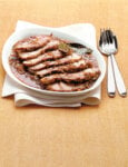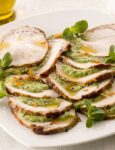 3) Farcisci e completa. Scola il cappone dalla marinata, conservando il liquido e farciscilo con il ripieno preparato. Ricuci l'apertura con ago e filo, poi lega l'intero cappone con lo spago da cucina. Ponilo in una pirofila con 2 cucchiai d'olio extravergine di oliva e abbondanti fiocchetti di burro; cuoci in forno a 180° per 120 minuti circa, bagnandolo di tanto in tanto con il liquido della marinata. Sforna e lascia intiepidire l’arrosto di cappone ripieno e servilo a fette, accompagnato con mostarda e pezzetti di gelatina di brodo di carne.