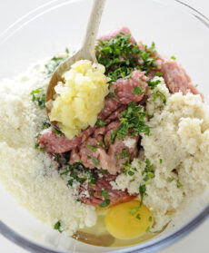 Mescolate in una ciotola i 2 tipi di carne macinata con la salsiccia privata della pelle, l'uovo, la mollica di pane bagnata nel latte e strizzata, 2 cucchiai di prezzemolo tritato, la cipolla stufata e lasciata raffreddare, il Parmigiano Reggiano, il pecorino grattugiato, 1 pizzico di noce moscata, sale e pepe. Se vi piacciono sapori decisi, aggiungete al ripieno 80 g di mortadella macinata.