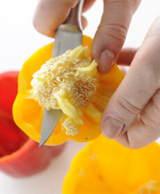 Per questa ricetta vanno bene tutte le tipologie di peperoni, tondeggianti, quadrati, allungati, di dimensioni più o meno grandi; è importante , però, sceglierli di forma regolare in modo che, sia usati intera, sia tagliati a metà, possano diventare piccole ciotole da riempire a fantasia.