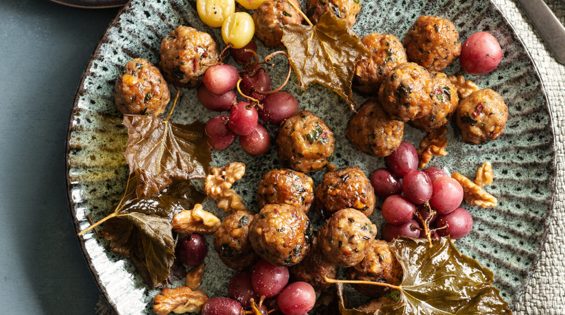 4 Intanto, scaldate abbondante olio in una padella antiaderente, unite rosmarino e le polpette e rosolatele fino a doratura. Sgocciolatele su carta da cucina e servitele con i grappolini d'uva e le noci.