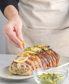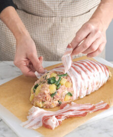 Fasciatelo con le fettine di pancetta sovrapponendole un poco e legatelo con qualche giro di spago da cucina. Inserite sotto lo spago qualche fettina di limone e dei rametti di timo.