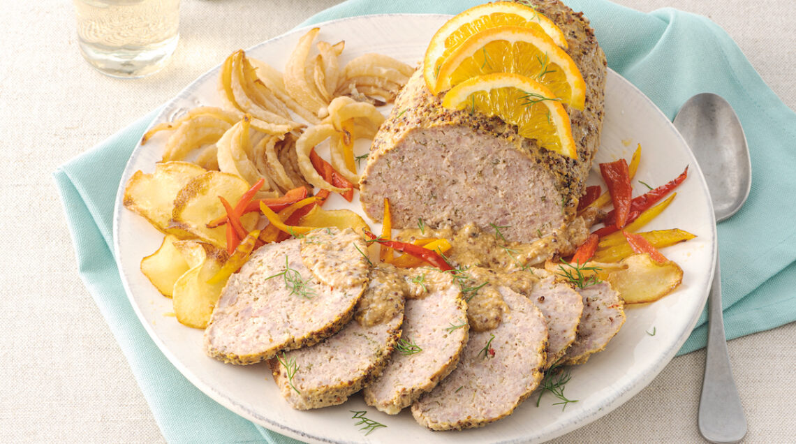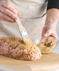 Formate un polpettone e spennellatelo con la senape. Avvolgetelo con carta da forno chiudendola a caramella ben stretta e mettetelo in frigo per 30 minuti. Fasciatelo con un secondo foglio di carta da forno, mettetelo in una teglia e infornatelo a 180° per 50 minuti. Eliminate la carta, irrorate il polpettone e il fondo della teglia con un po' d'olio extravergine e proseguite la cottura a 200° in funzione grill per 10-15 minuti girandolo più volte finché sarà dorato. Fatelo riposare per 15 minuti fuori dal forno.