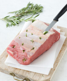 Tagliate a filettini uno spicchio d'aglio e infilateli in punti diversi nella lombata in cui avrete praticato delle profonde piccole incisioni con la punta di un coltellino, inserendo anche qualche ciuffo di rosmarino; legate la carne con qualche giro di spago da cucina.