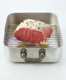 Sistemate il roast beef in una teglia appoggiando prima sul fondo del recipiente una piccola griglia in modo che la carne resti sollevata; spennellatela con un filo di olio e passatela in forno a 220° per 10 minuti, finché sarà dorata.