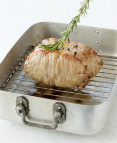 Abbassate la temperatura del forno a 180° e cuocete il roast beef per altri 30-40 minuti, secondo se la preferite al sangue o leggermente rosata. Durante la cottura ungetela di tanto in tanto con un filo di olio, utilizzando un rametto di rosmarino.