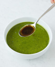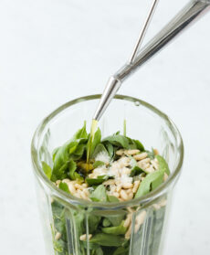 Lavate e asciugate delicatamente le foglie di basilico, prezzemolo e maggiorana e raccoglietele nel frullatore; aggiungete l'aglio rimasto a pezzetti, i pinoli, il pecorino e un pizzico di sale grosso; frullate versando olio a filo fino a ottenere una salsa densa e cremosa.