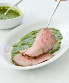 Insaporite il roast beef con il sugo qualche minuto prima di sfornarlo, salatelo e pepatelo, poi toglietelo dal forno e lasciatelo raffreddare. Diluite il sugo di cottura della carne sul fondo della teglia con poca acqua calda, filtratelo, unitene un cucchiaio al pesto e mescolate bene.