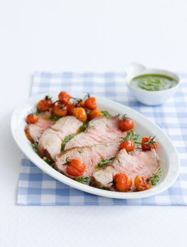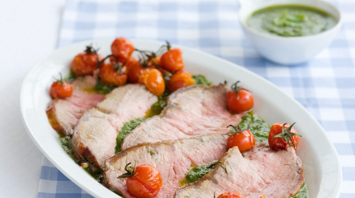 Passate i pomodorini su una griglia calda. Tagliate il roast beef a fette dello spessore di circa un cm. Versate qualche cucchiaio di pesto su un piatto da portata, sistematevi sopra le fette di carne leggermente accavallate e con i pomodorini.