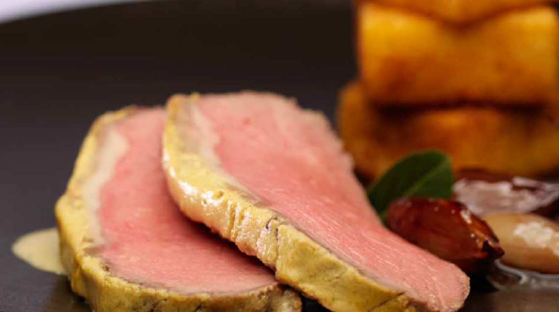 3) Passare le fette di polenta prima nella farina, poi nelle uova precedentemente sbattute e nel pangrattato. In una padella rivestita, friggere nell'olio le fette fino a farle dorare. Aggiustare il fondo di cottura del roastbeef. Tagliare la carne a fette e servirla con le fette di polenta fritte, gli scalogni caramellati e la salsa.