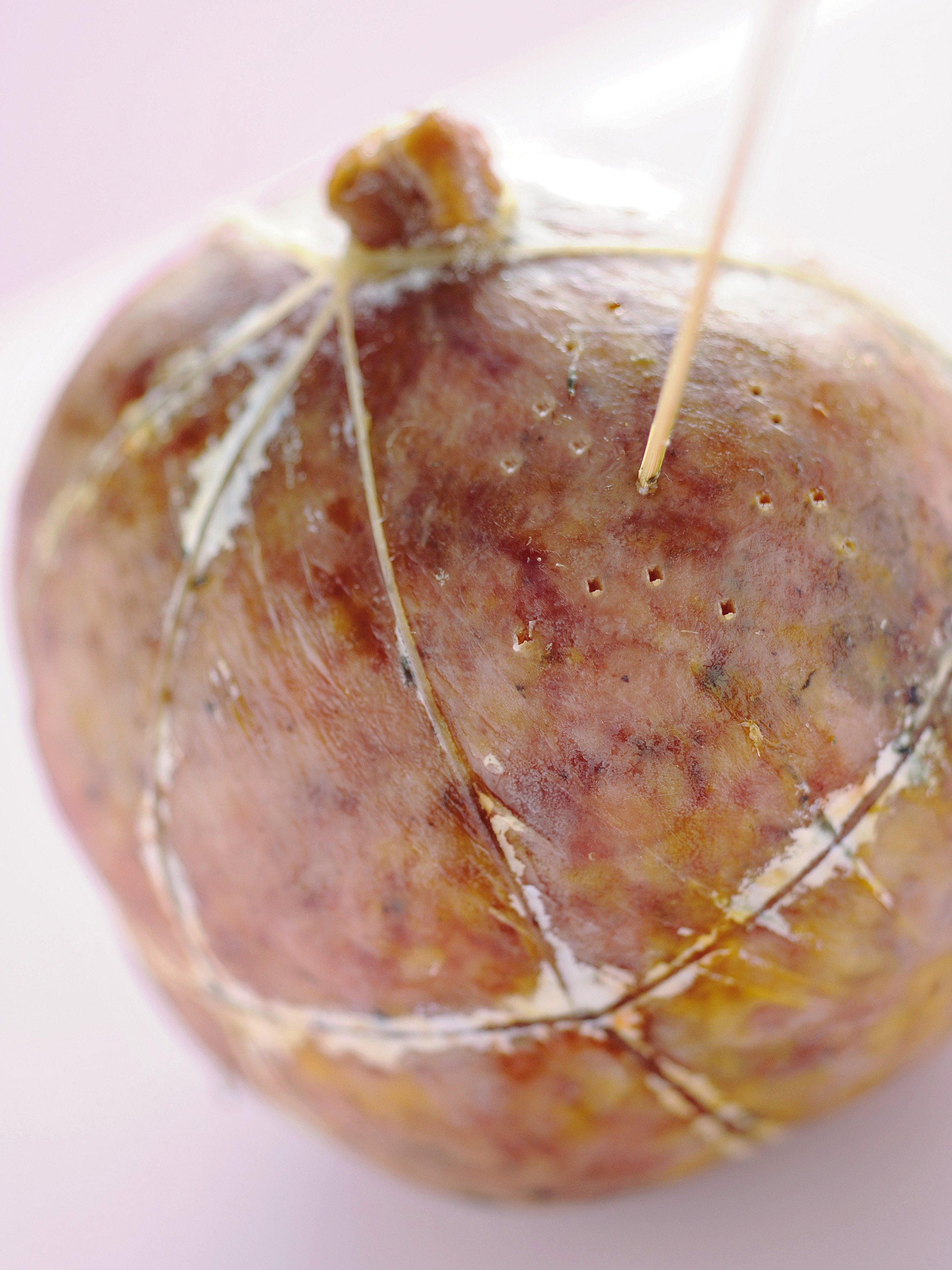 3) Scola la bondiola dall’acqua e posizionala in una ciotola per farla raffreddare. Spella la bondiola e tagliala a fette. Impiatta la bondiola con una schiacciatina di riso e un po’ di gremolada.