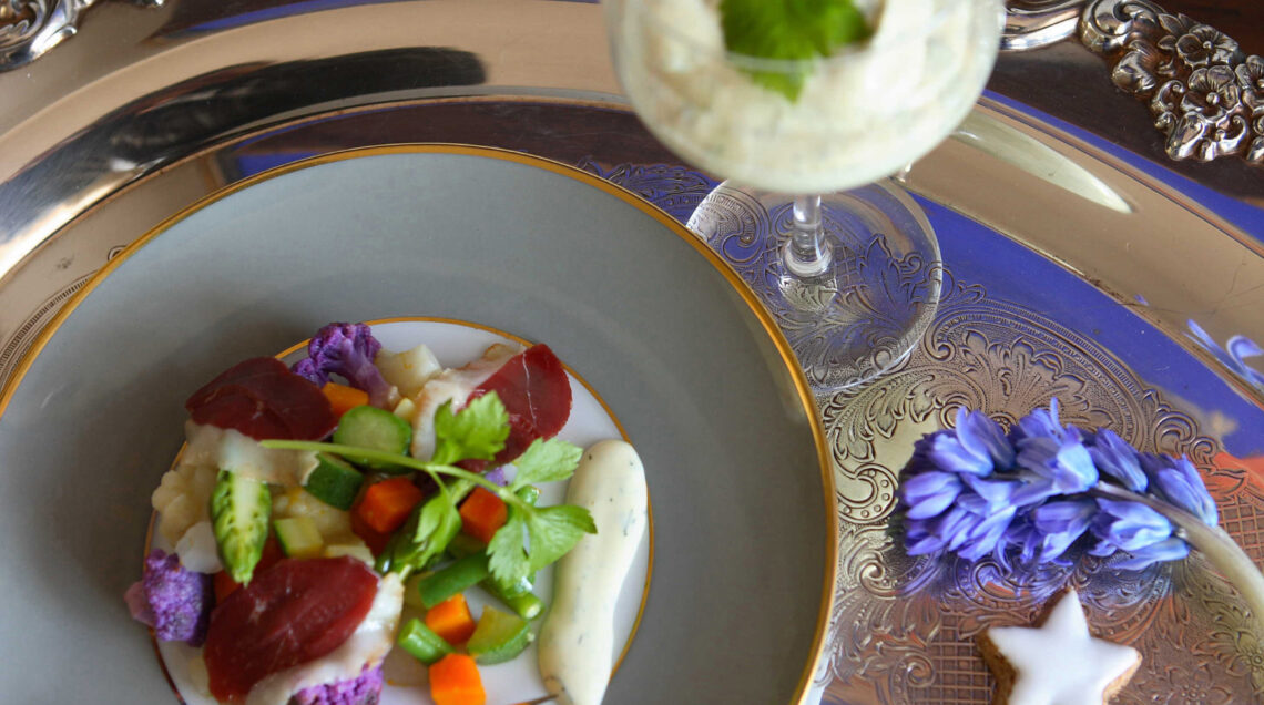 Un grande classico della tavola di Natale, l'insalata russa, è qui reinterpretata con leggerezza ed eleganza. Il piatto è scomposto e poi ricomposto accostando verdure di stagione e primizie con fettine di speck d'anatra, condite con leggera maionese all'aneto. Un piatto leggero, creativo, gourmand.