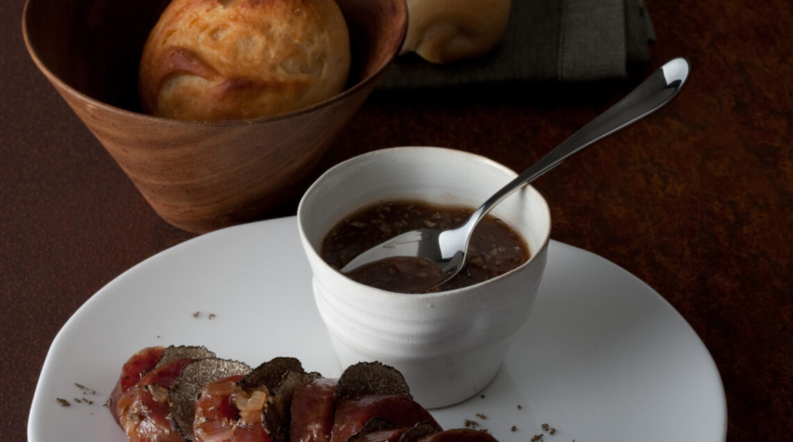 3) Ricava dal tartufo nero 12 fette e trita il resto, quindi aggiungilo alla salsa al cioccolato. Una volta cotta, estrai dal forno la salamella, elimina la carta e tagliane 12 fette.