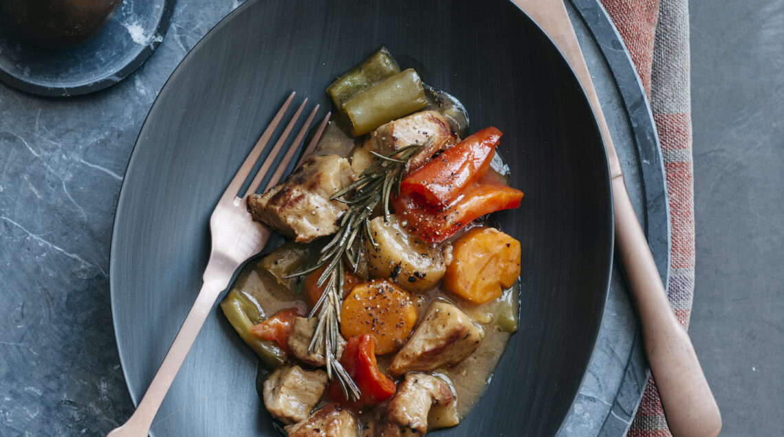 2) Sgocciolate la carne dalla marinata e rosolatela in una casseruola con un filo di olio; cuocete per 20 minuti, bagnando con un mestolo di marinata, quindi unite le verdure lavate e tagliate a pezzi; fate insaporire per qualche minuto, poi aggiungete il resto della marinata filtrata per eliminare le spezie.