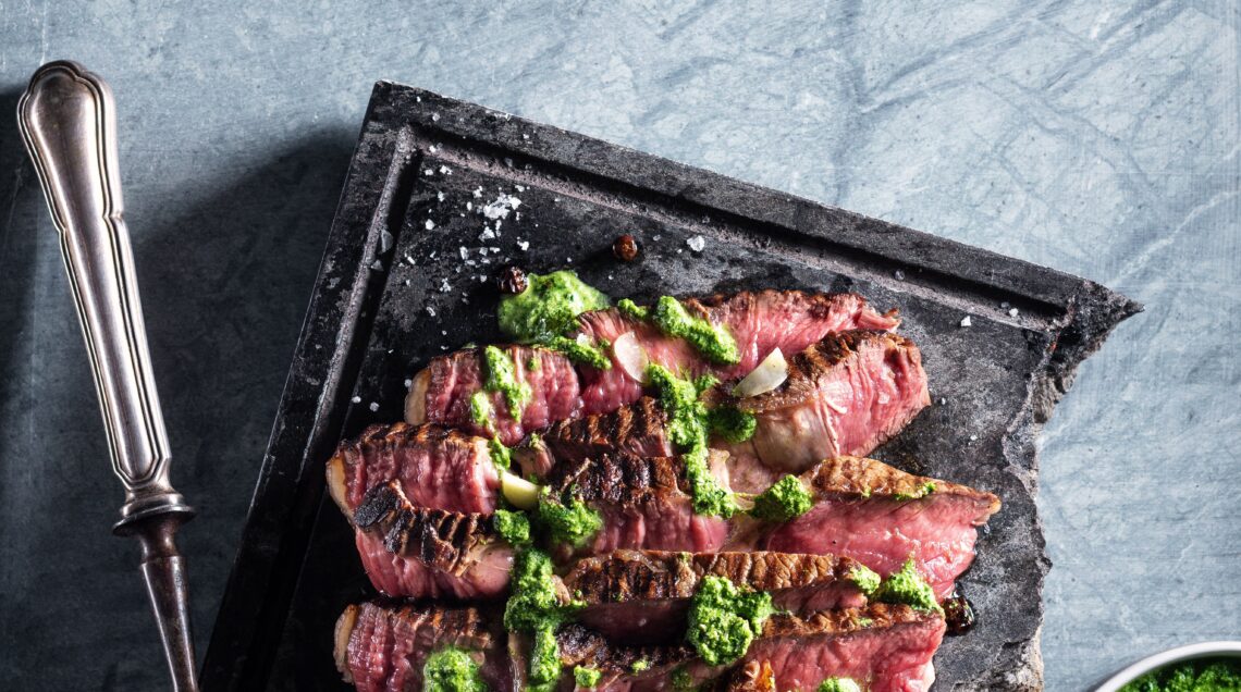 4)Cuocete la carne già salata su una piastra di ghisa ben calda 4 minuti per lato, girandola con una pinza. Irrorate con un filo di olio al ginepro e pepate a piacere; quindi avvolgete la costata in un foglio di alluminio e lasciatela riposare nel forno caldo per 2-3 minuti. Eliminate l'osso, affettate la carne e servitela con il pesto di cavolo nero e, a piacere, aggiungete ancora qualche goccia di olio al ginepro.