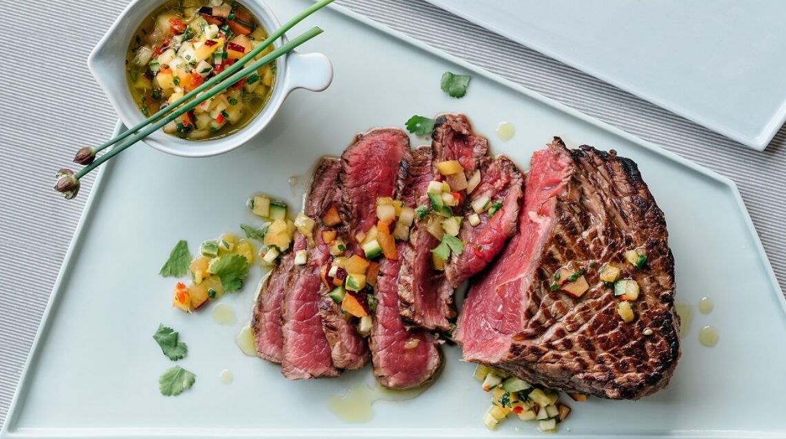 4) Scaldate una piastra in ghisa scanalata e cuocetevi le fette di carne sgocciolate dalla marinata, circa 3 minuti per lato. Avvolgete le fette di carne con un foglio di alluminio e lasciatele riposare due o tre minuti, prima di affettarle e servirle con l'insalata di frutta.