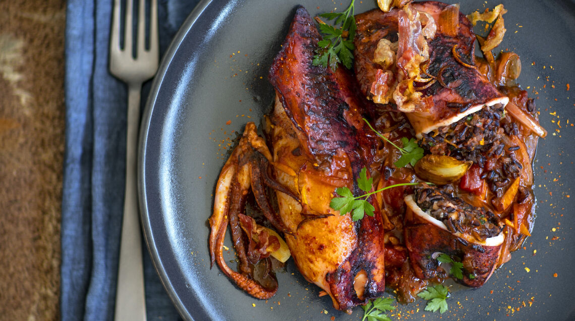 2) Tritate al coltello 4 fette di coppa e soffriggetele in una padella con 2 cucchiai d'olio, la cipolla e 1/2 spicchio d'aglio. Unite i tentacoli tritati e, appena cambiano colore, sfumate con poco vino. Aggiungete metà dei pomodori, qualche foglia di basilico, salate e cuocete 10 minuti a fuoco vivace. Incorporate il riso e fate insaporire 5 minuti. Spegnete, fate intiepidire, farcite i calamari con la preparazione e chiudeteli con uno stecchino. Lavate l'arancia, ricavate 2 strisce di scorza e riducetele a julienne, poi spremete il succo.