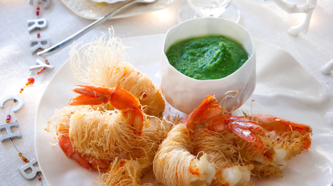 Avvolti in una matassa di fili croccanti, questi crostacei speziati risultano scenografici e gustosi grazie all’abbinamento con una salsa densa e piccantina