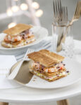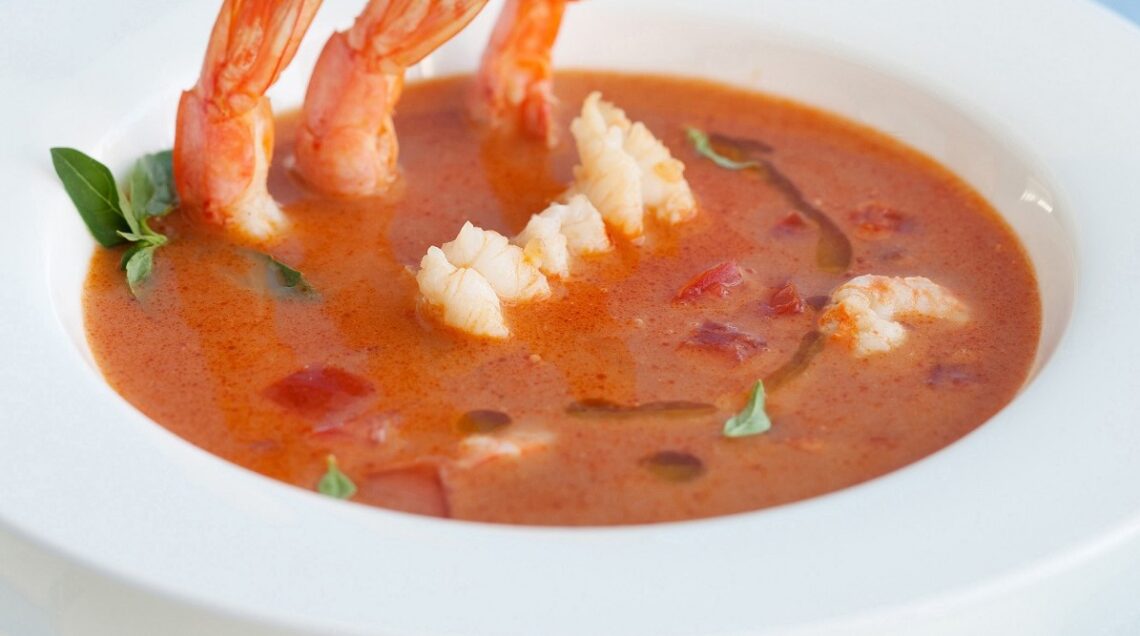7) Distribuite la zuppa nei piatti, immergete in ciascuno 3 code di gamberoni, unite i gamberetti e guarnite con basilico, cubetti di pomodoro e aglio fritto.