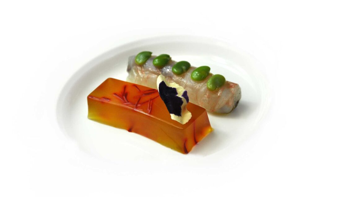 1) Porta il consommè di crostacei a 36°C ca, incorpora la colla di pesce precedentemente ammollata, filtra e versa negli stampi, aggiungi i pistilli di zafferano e “fai tirare” in frigorifero.