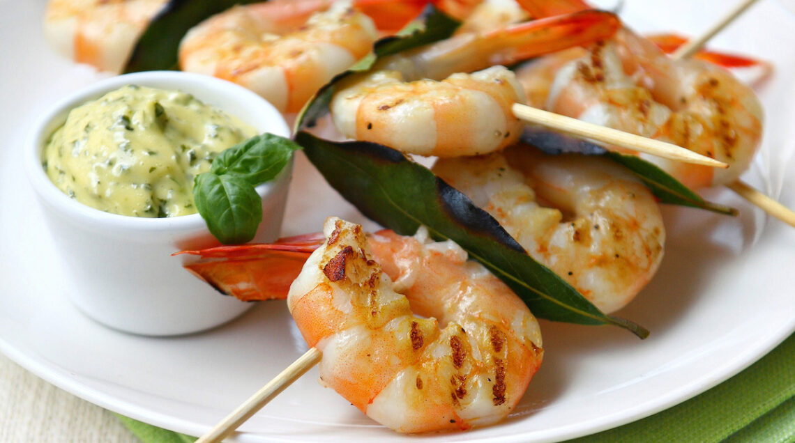 Il segreto di questi semplici spiedini di gamberoni è l’abbinamento con due erbe molto caratterizzanti. L’alloro che separa i crostacei ha aroma intenso e consistenza coriacea, tanto che al momento di gustare il piatti si scarta, ma di contro regge benissimo la cottura che ne sprigiona i profumi. Il basilico, seppure più delicato (e naturalmente edibile), regala alla maionese di accompagnamento note immediatamente riconoscibili.