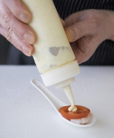 Preparate le due salse Yuzu Miso e Yuzu Kosho amalgamando in una ciotola, metò acqua, mela e colla di pesce e in una seconda ciotola l'acqua rimasta, la cipolla, il vino, il burro, l'amido e le uova di tobico.