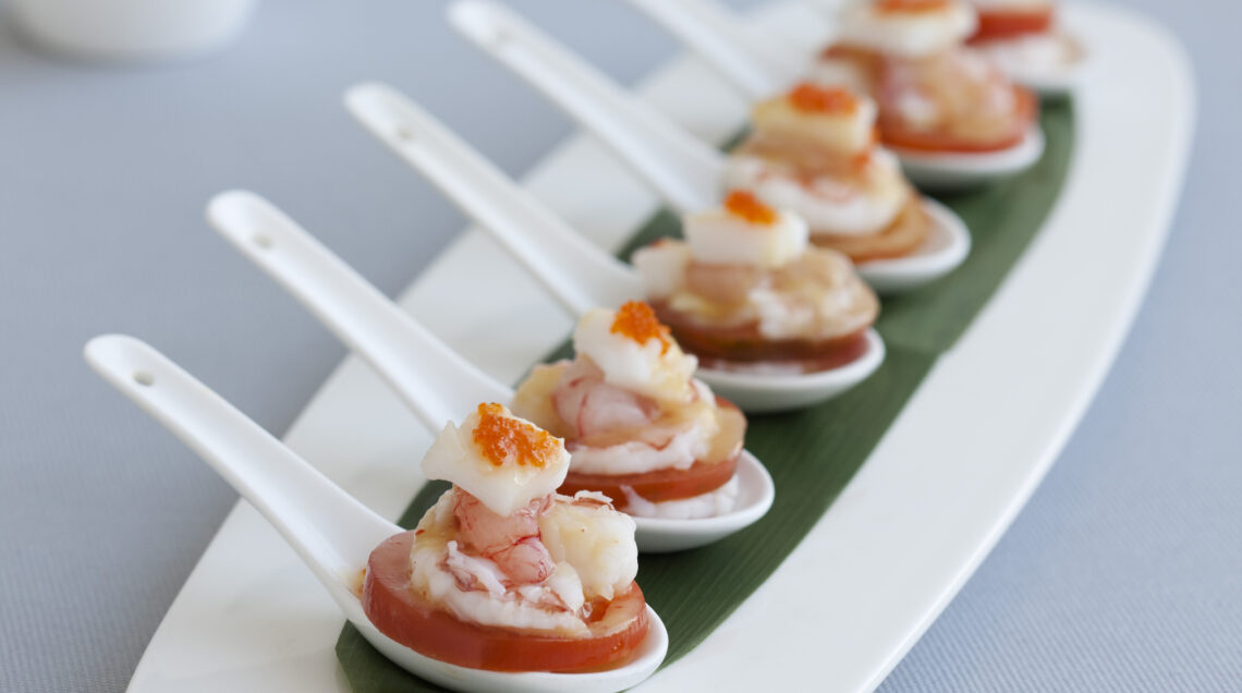 Proseguite con un'altra mezza coda di gambero, un pezzetto di gambero rosso crudo, un quadretto di calamaro, poca salsa Yuzu Miso. Guarnite con il tobiko rosso, disponete i cucchiaini su un piatto coperto con una foglia di bamboo e servite.