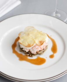 Aggiungi sopra gli scampi la spuma di patate, e le patate dorate. Ripeti l’operazione per tutti i tortini e poi togli l’anello.