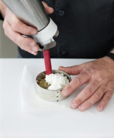 Lessa le patate rimaste, tagliale a tocchetti aggiungendo all'acqua la panna, salale, frullale e passale al colino a maglie fini. Inserisci la crema nel sifone caricato con le apposite bombolette e tienilo caldo a bagnomaria. Se non hai il sifone monta la crema con il minipimer e tienila comunque in caldo.