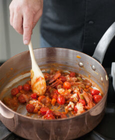 In un passaverdura trita la salsa del tortino di scampi, poi mettila in una casseruola e falla ridurre sul fuoco.