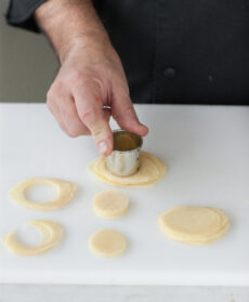 Sovrapponi i cerchi formando delle rosette, e spennellale con il burro chiarificato. Per ogni rosetta ti serviranno circa7/8 cerchi di patate. Cuoci in forno a 160° per 15 minuti: trascorso questo tempo scola il burro in eccesso, sala e lascia al caldo.
