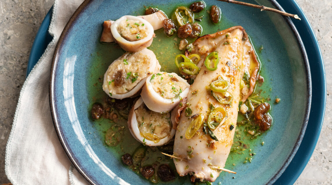 Una ricetta semplice e strutturata al tempo stesso, preparata con calamari freschissimi farciti con un miscuglio di pane, uvetta e pinoli. La salsina aromatica e piccantina regala un bouquet inaspettato al piatto
