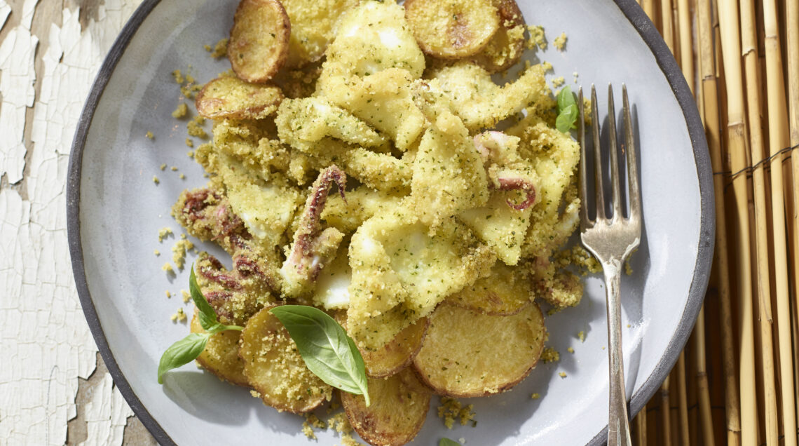 Calamari sodi e patate morbidi si incontrano sotto un trito di aglio e prezzemolo. Una passata il forno e il gratin è servito