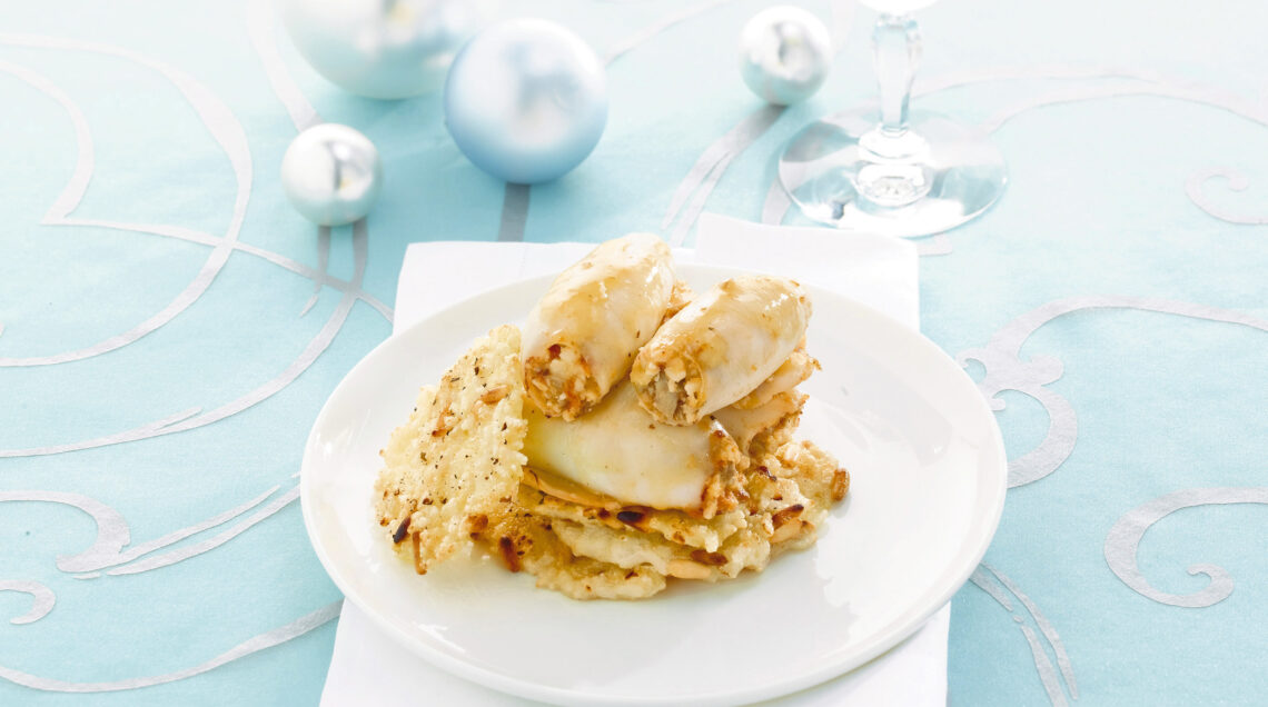 4) Unisci il branzino, spruzza con un po’ di vino e lascia cuocere per qualche minuto. Spegni ed aggiungi il pangrattato. Prendi i calamari, taglia la punta e farcisci con il composto. In una teglia da forno aggiungi 2 cucchiai di olio, sistema i calamari e bagna con 2 cucchiai di vino. Inforna per 20 minuti a 170°.