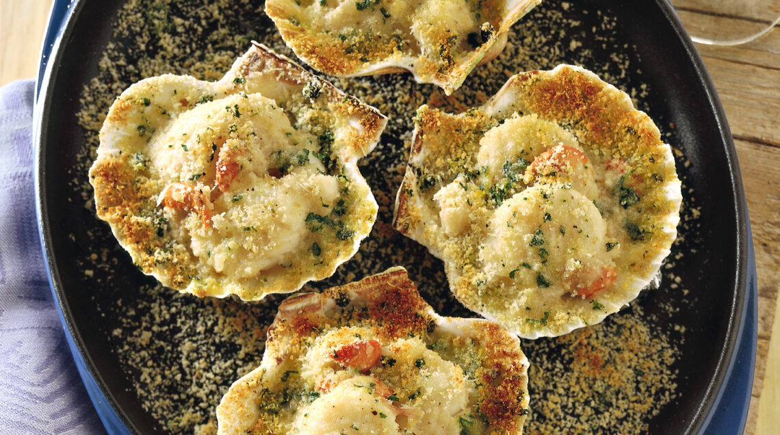 5) Lava bene 8 mezze conchiglie (la parte concava) delle capesante, asciugale, imburrale e spolverizzale con un poco del composto di pangrattato; metti in ogni guscio un cucchiaino di salsa al vino, 2 noci e 2 coralli di capesante, ancora poca salsa e cospargi il tutto con il restante composto di pane.