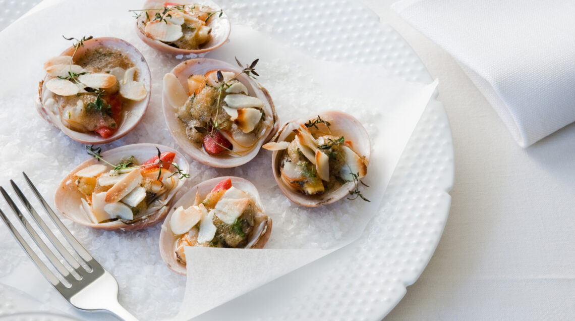 1) Copri la placca con forno il sale grosso. Apri i fasolari al vapore oppure in una larga padella coperta. Man mano che si aprono allineali sulla placca (il sale serve a tenerli in equilibrio) eliminando la valva vuota.